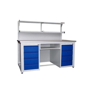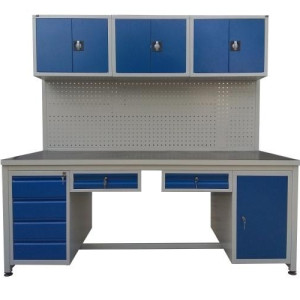 Kolejnymi akcesoriami do stołów montażowych są listwy, umożliwiające zawieszenie pojemników warsztatowych z tworzywa, gdzie trzymane są np. elementy wykorzystywane w trakcie procesów produkcyjnych. Na pewnej wysokości od blatu montujemy również panel z włącznikiem do lamp oraz gniazdkami, które umożliwią używanie urządzeń elektrycznych (po uprzednim podłączeniu tych elementów do fabrycznej sieci elektrycznej). Najczęściej w stelażu nadblatowym montowana jest perforowana ścianka narzędziowa, umożliwiająca zawieszanie różnych elementów lub narzędzi wykorzystywanych przy pracy. Znacznie ułatwiają to oferowane przez nas zawieszki (na młotki, śrubokręty, wiertła i in.). W górnej części ścianki można również umieścić dodatkowe szafki z półkami, zamykane na klucz.