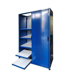Produkcja mebli metalowych na mocno zautomatyzowanych liniach ma swoje mocne ale i słabsze strony. Do tych drugich należą m.in. ograniczenia maksymalnych wymiarów. Jesteśmy w stanie zaoferować Państwu szafy o ponadnormatywnych wymiarach, oparte na konstrukcji z profili stalowych. Całość obudowana jest blachą i zamykana drzwiami przesuwnymi (z racji znacznej szerokości) z uchwytami.